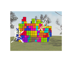 La estructura del proyecto nace a partir de un cubo de 2m x 2m x 2m, el cual se decide dividir en 8 columnas y 8 filas de 25 cm, para asi crear unas piezas de cubos de 25cm x 25cm, que jugando con la intension de recrear el recuerdo del juego de infancia se forman 4 piezas de tetris, que finalmente estas conformaran la estructur a y la forma del habitaculo.